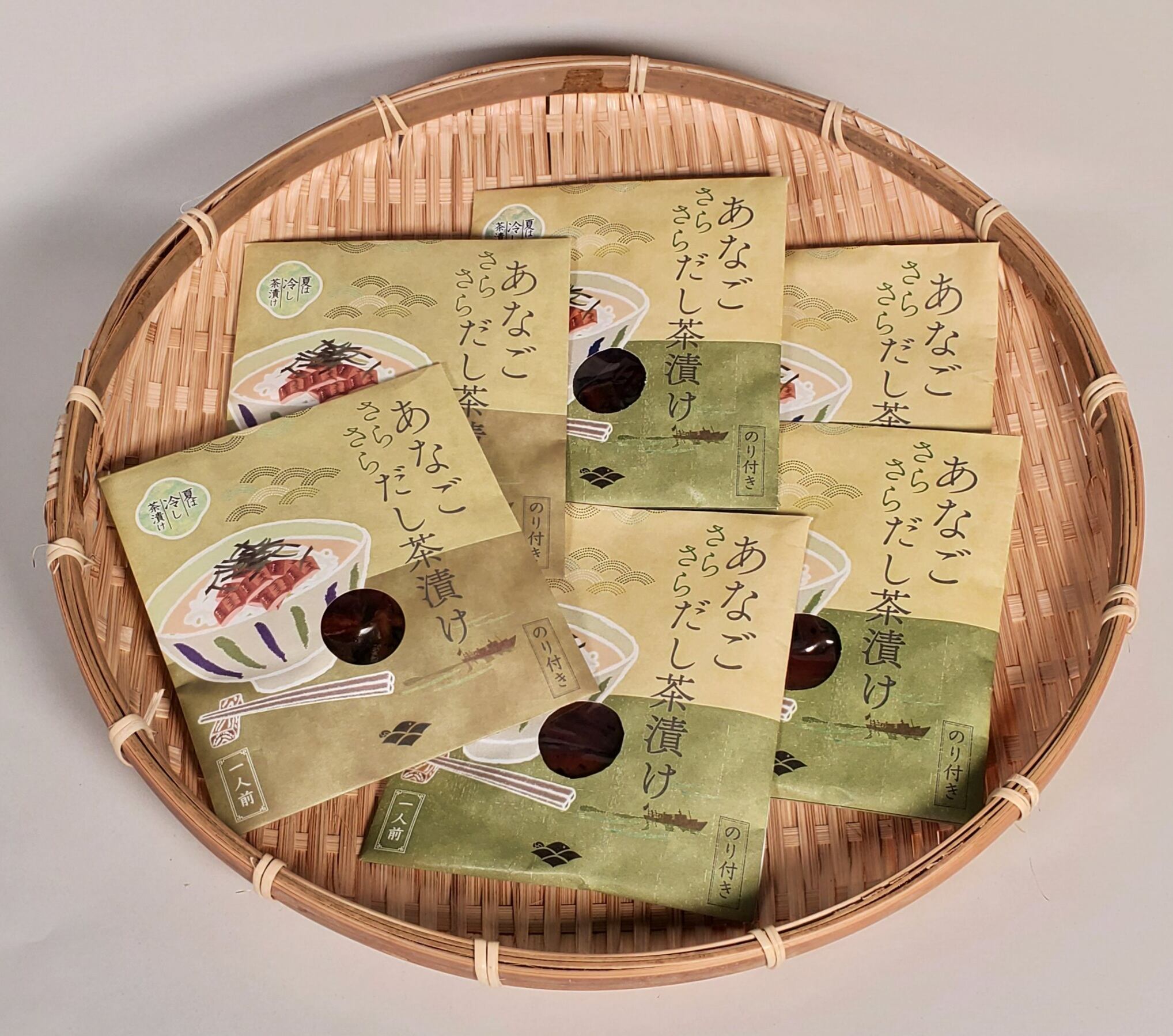 日本海で獲れた真穴子に秘伝のタレを何度も塗り重ね焼き上げたあなご蒲焼きをお茶漬けにしました。甘くて美味しいあなご蒲焼きと鰹・昆布風味の塩味が効いたダシとのバランスがピッタリなお茶漬けです。