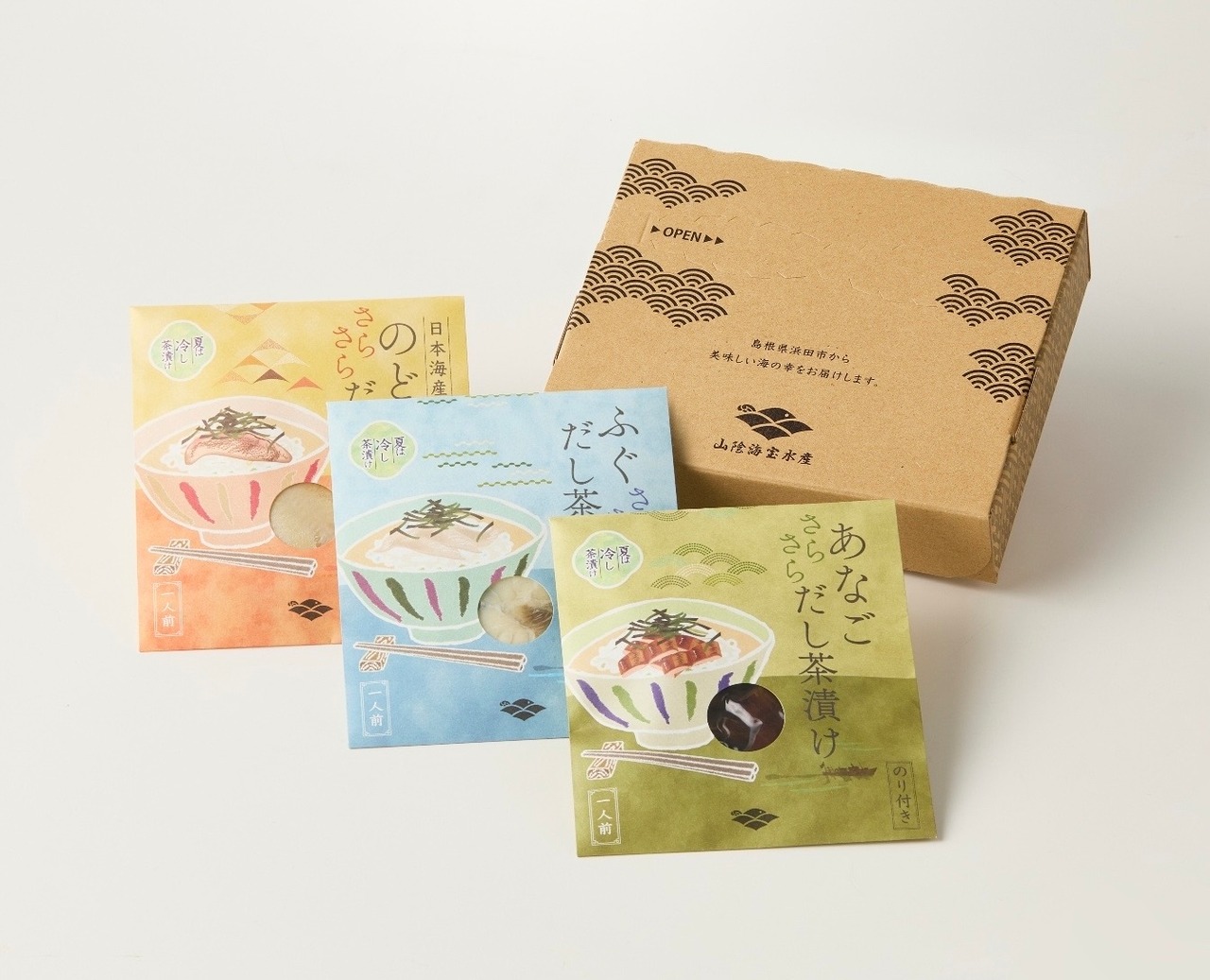 新鮮な日本海の恵みをたっぷり詰め込んだ「日本海お茶漬けセット」は、のどぐろ、ふぐ、あなごの3種類を贅沢に味わえるお試しセットになります。